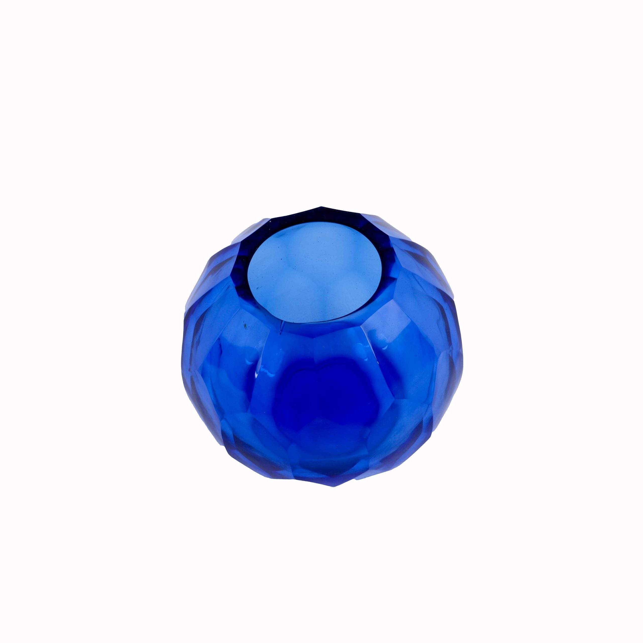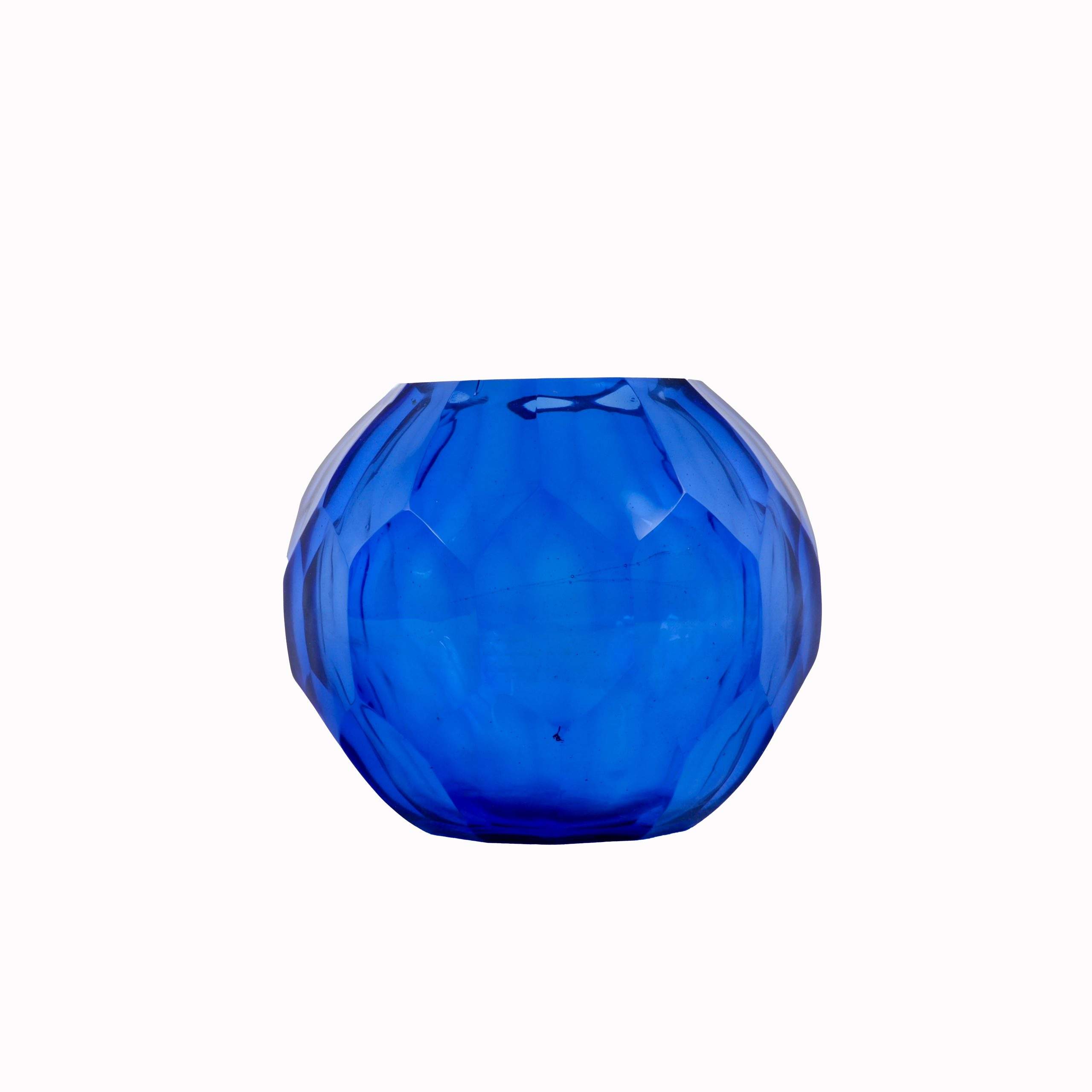 Add a touch of elegance to your home with our GLASS ROUND VASE-BLUE. Perfect for flowers or as a standalone piece, this vase features a unique geometric design and a rich blue hue.