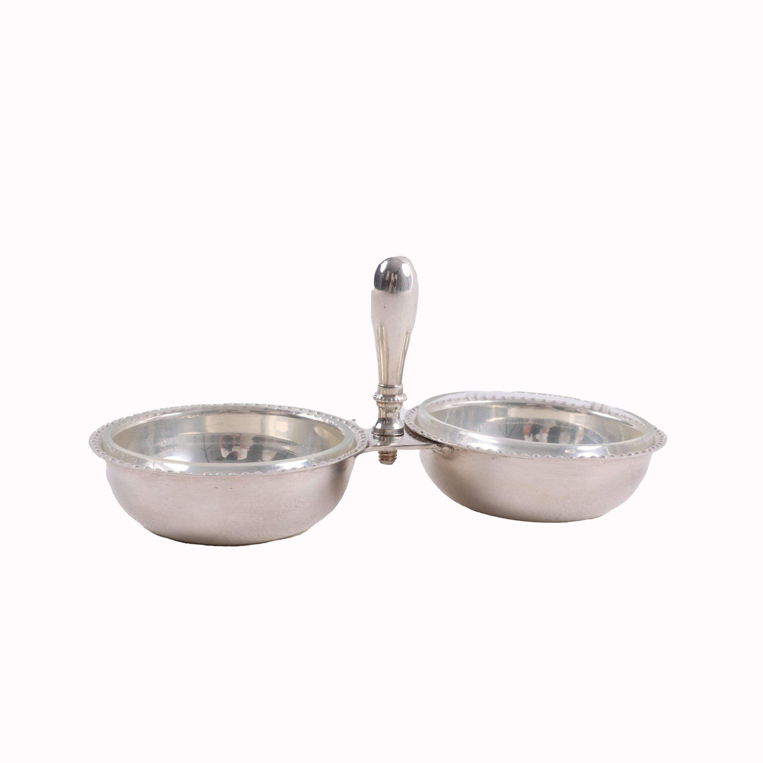 The central handle not only enhances the convenience of use but also adds a classic touch to the overall design, making it suitable for both formal and informal dining occasions. Its reflective silver surface catches the light beautifully, adding a touch of luxury to your table setting. Crafted from high-quality materials, this dish ensures durability and longevity, making it a valuable addition to your dining collection. Ideal for those who appreciate fine dining ware and elegant table settings, this silver condiment dish is sure to impress your guests.
