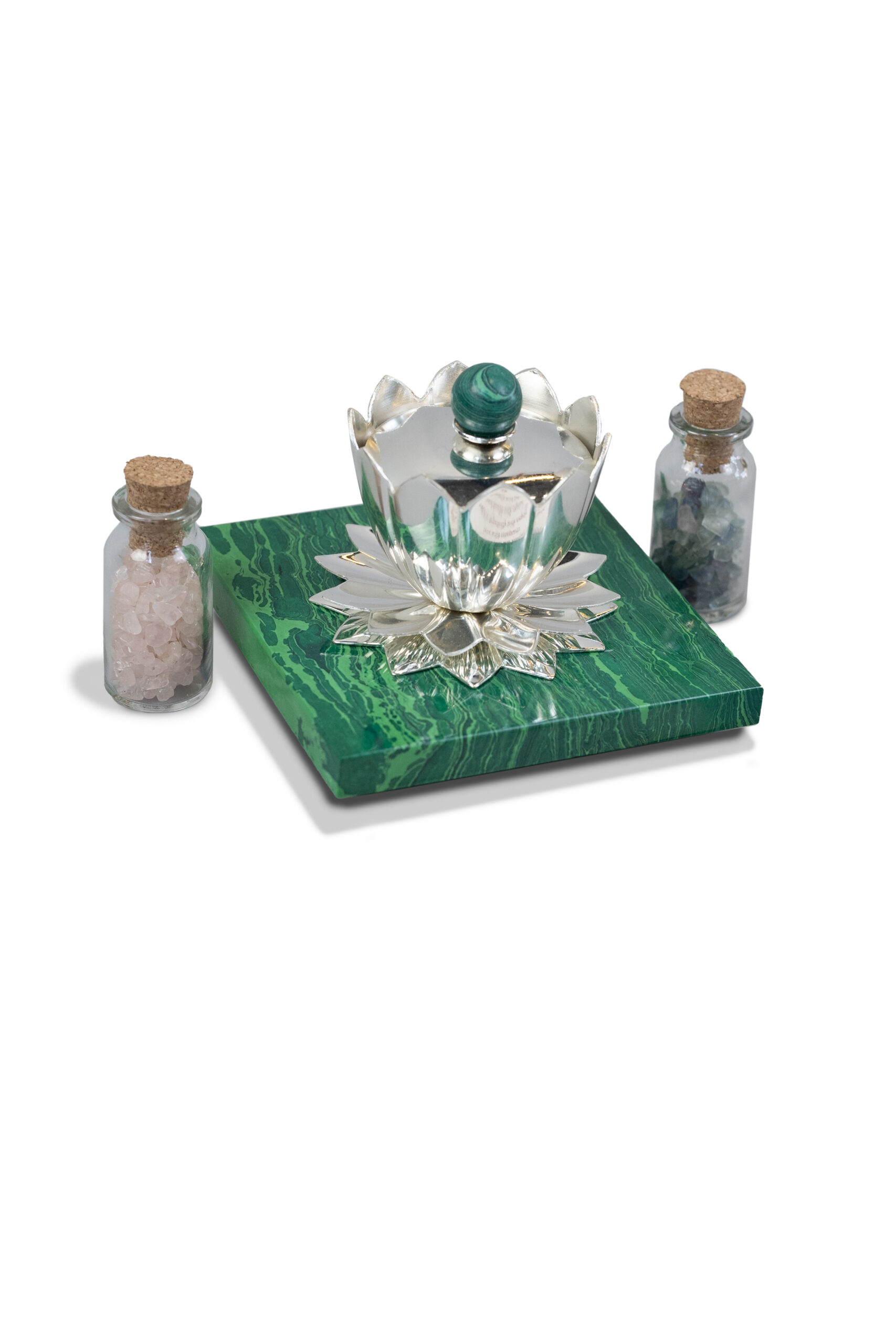 Silver Tea Light Lotus Square Malachite with Lid Dark Green Marble quantity